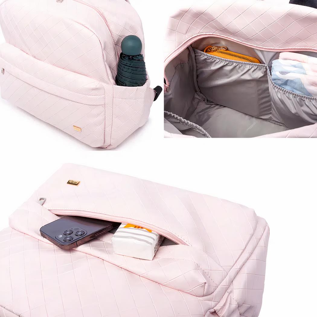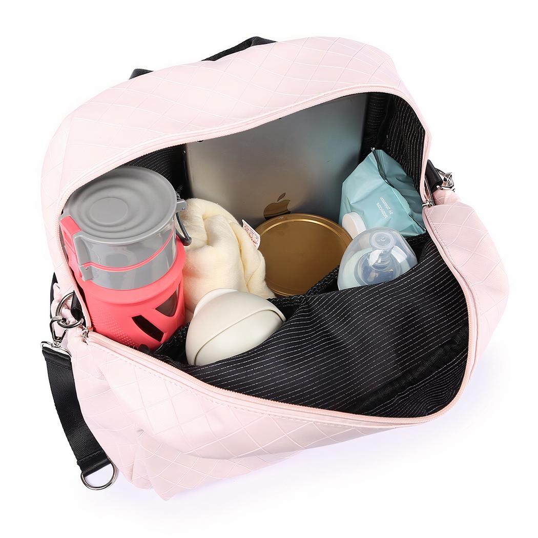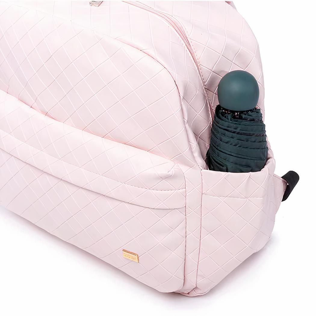 El bolso cambiador es un accesorio práctico y elegante para los padres. Con su estampado de cuadros rosas, ofrece un toque moderno.