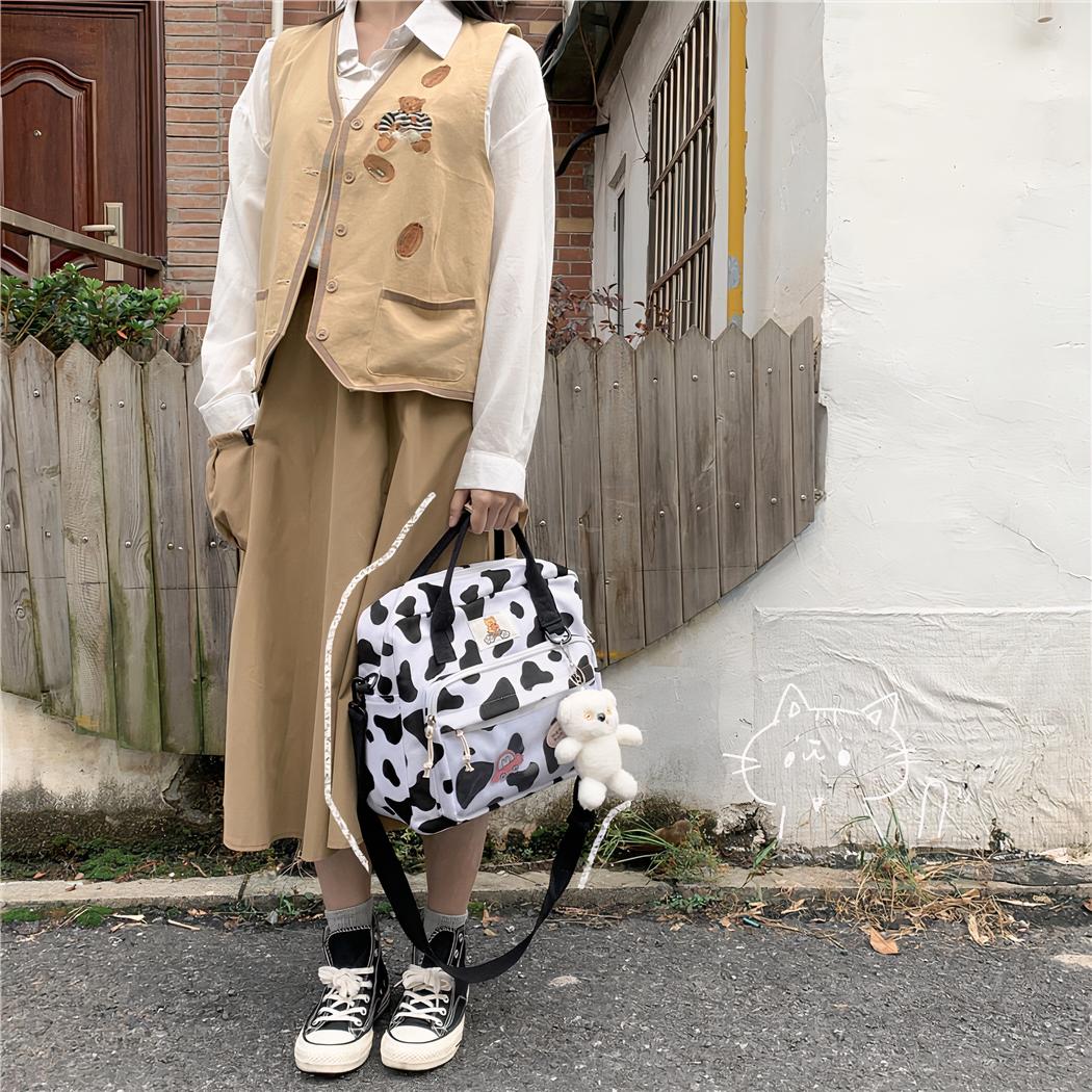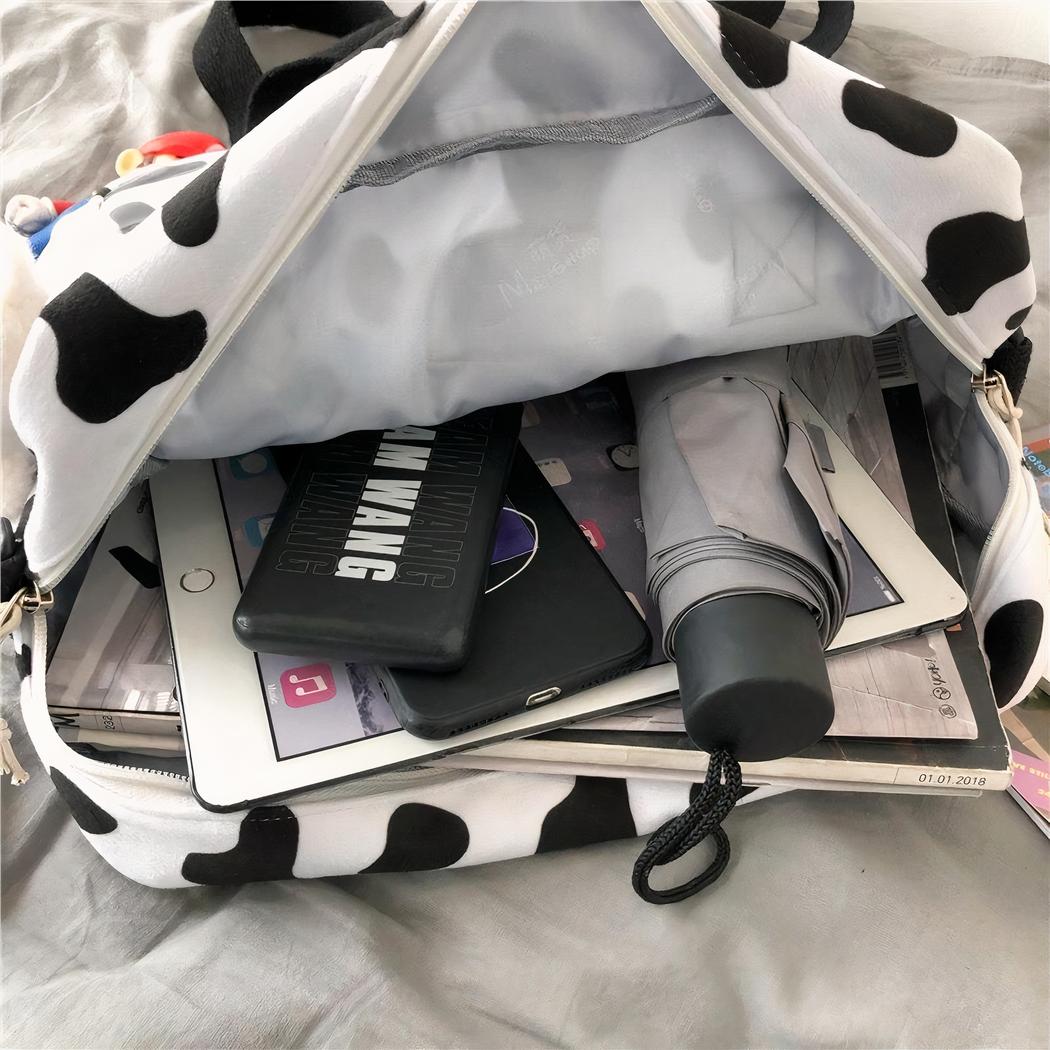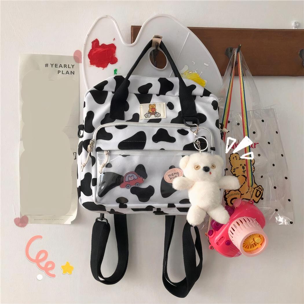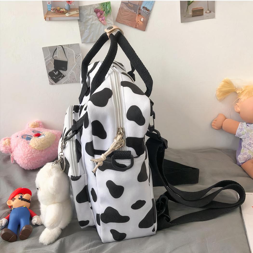 Su estampado de vaca en blanco y negro aportará un aspecto único a sus conjuntos. La mochila también cuenta con una correa ajustable y acolchada para los hombros para mayor comodidad.
