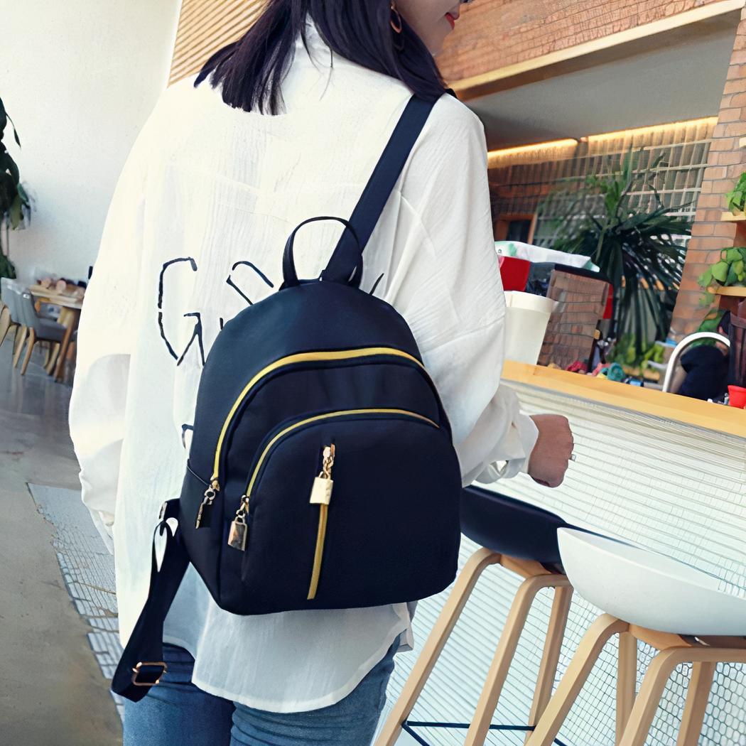 Esta mochila negra para mujer es perfecta para las actividades cotidianas. Su color oscuro y su estilo informal hacen que sea fácil de combinar con todo tipo de atuendos. Fabricada en poliéster, es muy resistente y duradera.