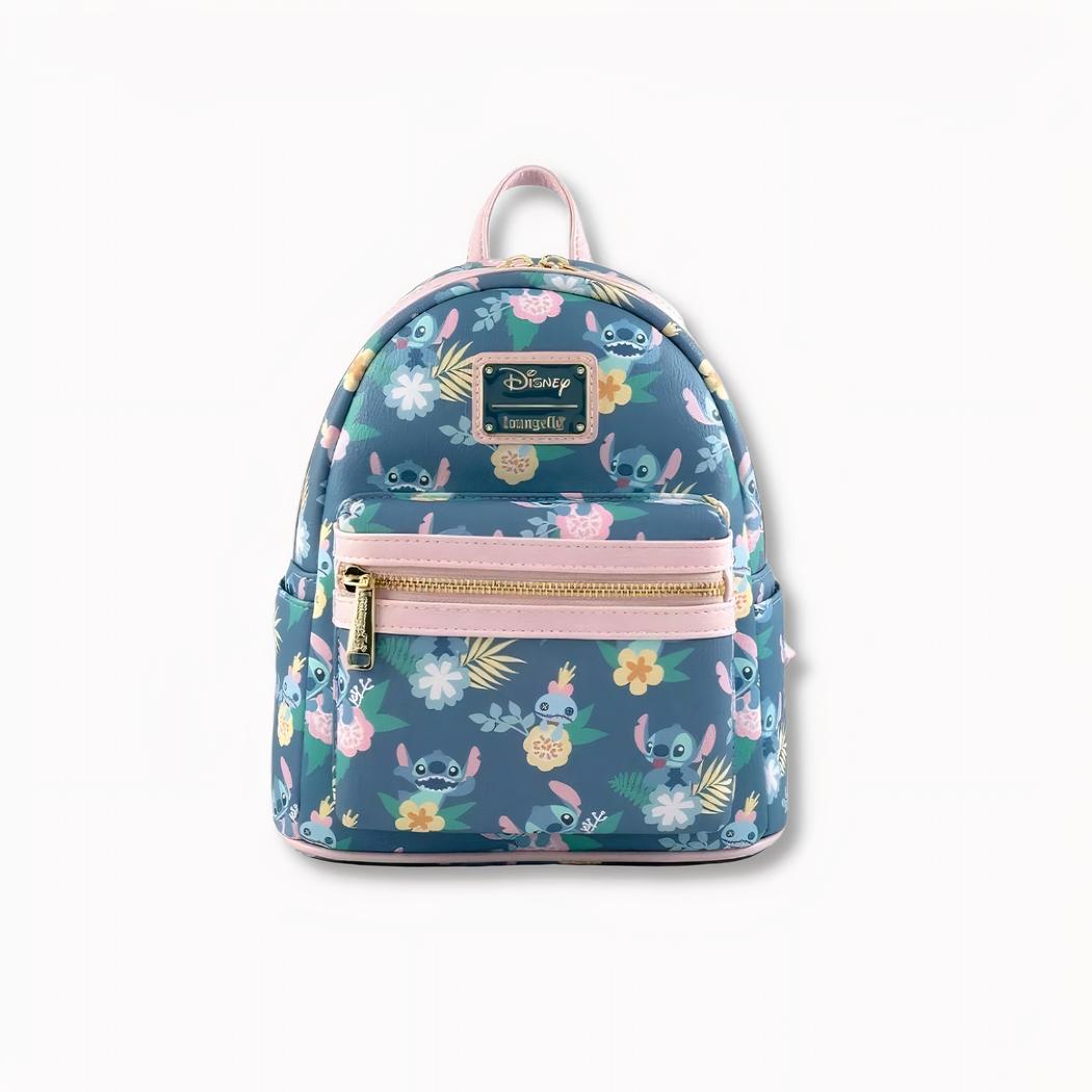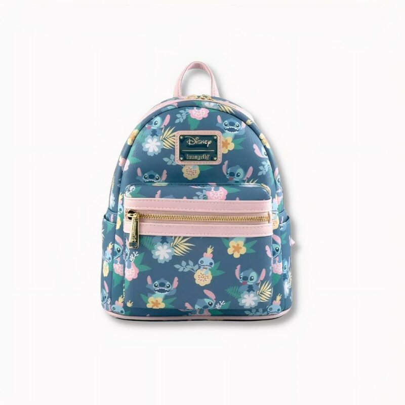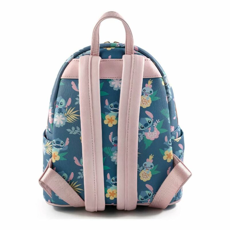 Esta mochila destaca por su excepcional estampado floral, en el que aparece Stitch rodeada de coloridas flores tropicales y hojas exóticas. Los tonos suaves y los delicados estampados crean un ambiente alegre y primaveral, que invita a la exploración y el descubrimiento.