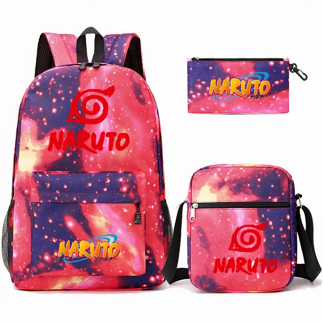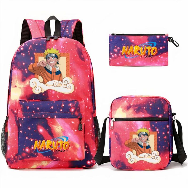 Consiga este set temático de Naruto, perfecto para los fans de la famosa serie de anime. El set incluye una mochila, una bandolera y un estuche. Todo ello adornado con motivos representativos del manga y un diseño de galaxia rosa.
